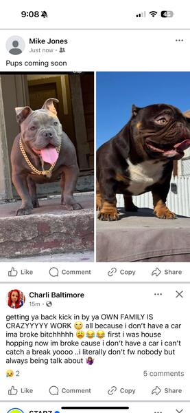 message mike about this ad Im having micro bully pups coming real soon the female is a ghost tri & and the male is tri color I have papers on both dogs shots well be given to all the pups cropping of the ears will be available for purchase if you have any questions you can contact me 862-417-6238 |