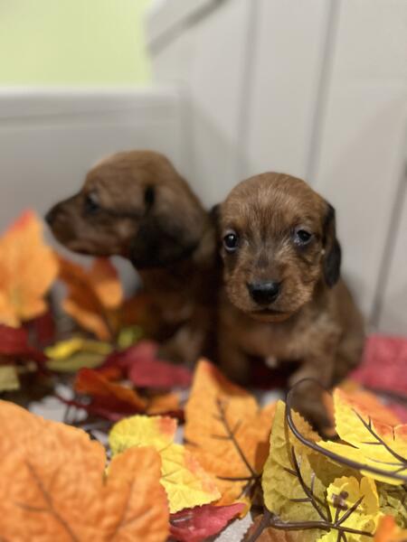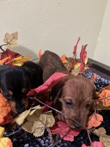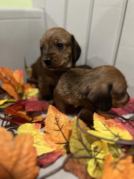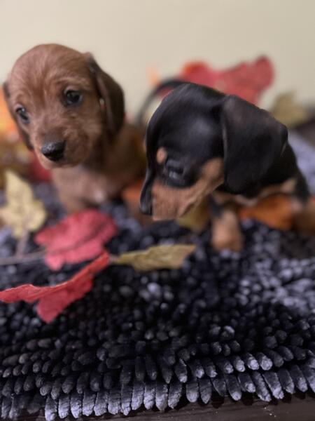 message mcdachs about this ad AKC & CKC Miniature dachshund puppies available. Smooth coats & wire coats, some black and tans and some shaded reds. Born September 1st and the other litter September 8th. Pups have been vet checked, dew claws removed, dewormer administer, and first puppy shots. For availability and pricing please call or text Margaret Cook at 219-393-0408 |