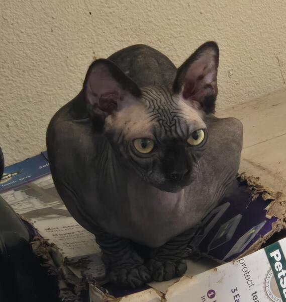message nudistcolony about this ad 8 month old black neutered sphynx male. He is microchipped and comes with a congenital health and HCM guarantee until he is 3 years old. |