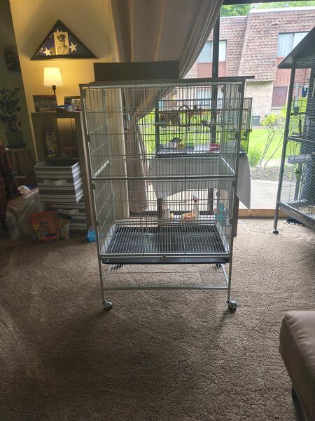 message turbo171 about this ad New, not used, flight cage. 31 in x 20 in x 52 in. Comes with caster, bottom removable tray and a shelf. Three perches and four dishes are included. |