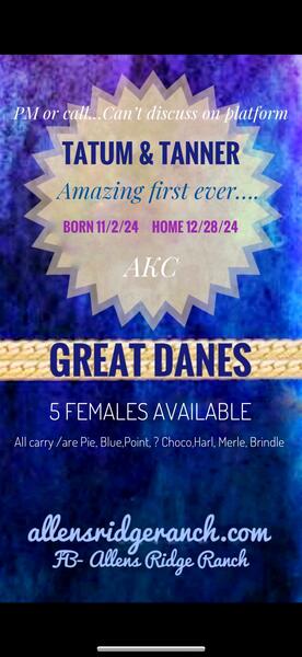 message tanpoint about this ad Tatum-Tanner 11-2-24 An all nighter as usual but Tatum/Tanner did fabulous. She is such a sweetheart, special girl to me What a variety of colors and patterns, including our FIRST Chocolate Brindle Pie who carries Tanpoint, Blue and ? Harlequin. We hope that you are ready for a dane baby to complete your life and home! A color and pattern that is is absolutely breathtaking An incredible black/White Pie mantle . This lap baby loves to snuggle already and suddenly fall asleep on me. So contented with life. We would be happy for you to meet this wee one on a video chat These lines are very quick to learn and love to please their family. Mom is a brindle harlequin pie, choc and tanpoint carrier and daddy is a massive blue pie genetic tanpoint, making the entire litter tanpoints in showing, genetic or carrier. Babies are a combined American-European. The perfect combination! Both parents are sweet, and gentle Scooby doo lap danes. If you want a precious snuggle dane, this baby is the one for you! We are excited to be able to raise this amazing litter of munchkin danes Home 12/24/24. message tanpoint about this ad |