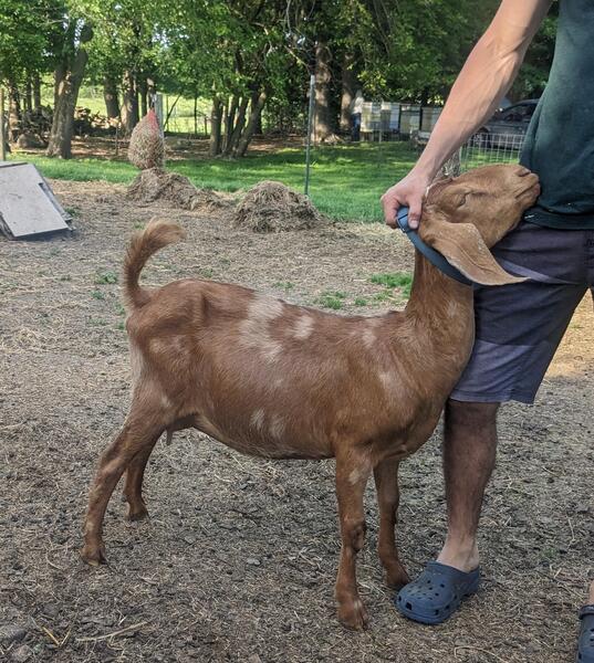 message hharless19 about this ad Spice is a yearling Boer Nubian cross doe. She kidded with a single buckling in March. Super sweet and beautiful girl. She really catches your eye with her striking red dapples. From a disease tested herd. She is also on a herbal deworming schedule. |
