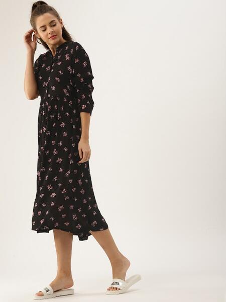 message rohinee about this ad Product Code: 7485874 Black printed woven fit and flare dress, has a mandarin collar, long sleeves, button closure, , flared hem Semi-Fit The model (height 5'8 is wearing a size S Give your closet a makeover with this stylish DressBerry dress. Wear your printed black piece with strappy heels and your favourite clutch for a night out on the town with your friends. 100% Viscose Rayon Machine-wash httpsmyntr.it/7cY9GAp |