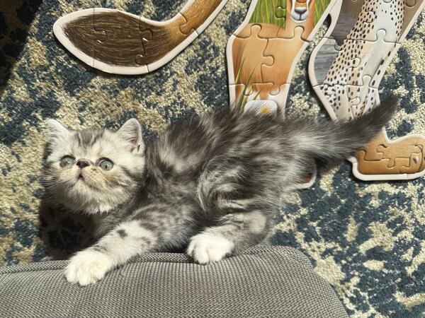 message gremlins about this ad This handsome exotic shorthair persian boy was born 8/4 and is a striking charcoal and silver tabby color. He is a head turner with a silky coat and has lots of love to give! He has been socialized in our home with a child, a small dog and other felines. You will love this little guy! If youre looking for a pair he has litter mates available! |