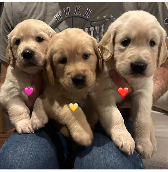 message poppyprimspups about this ad We have Two Female and One Male Golden Retriever Puppies available Our sweet litter was born on Aug 23rd and will be ready to go home on or after Oct 18th. The father is an AKC English Cream Golden Retriever with an amazing temperament and pedigree. The mother is our family dog who is also an AKC Golden Retriever who has been nothing but a blessing for our family. She is so loving and a perfect companion for us as well as our children. We have three puppies left. They will all be dewormed and have their first vaccinations. We have also taken each puppy through acclamation and socialization activities. They are all the sweetest pups and just need a forever family to love. Please don't hesitate to reach out with any questions. I'm more than happy to tell you more about them and their parents background. |