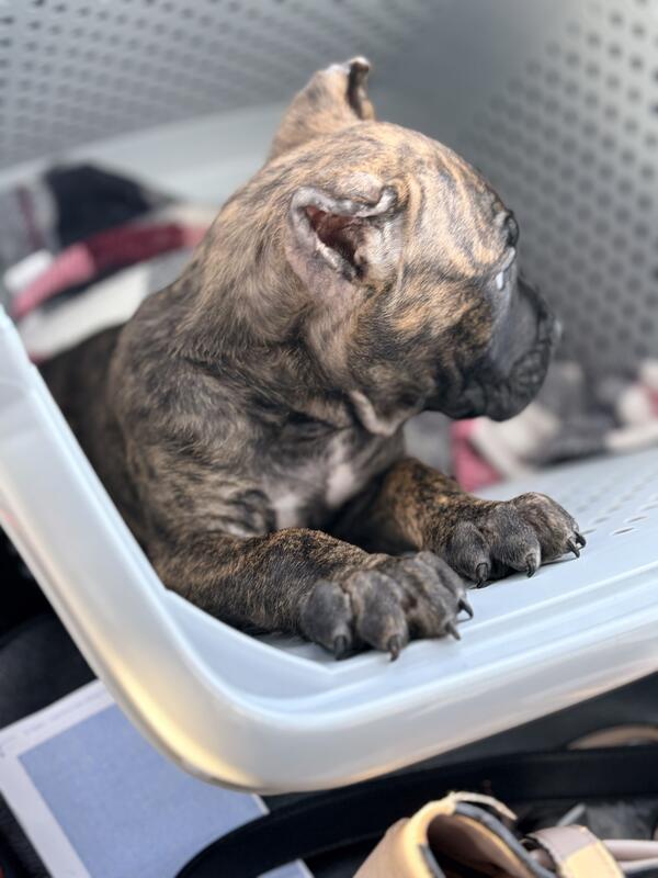 message badattitude71 about this ad Meet Paxton Born October 26, 2025 Available Now Paxton is a stunning exotic reverse black brindle Cane Corso male with deep black, mocha, and smoky undertones. He is ICCF registered and comes from champion bloodlinesh. His mom is a black Cane Corso with a white chest (on site and his dad is a solid blue Cane Corso imported from Hungary (on site both ICCF registered with excellent temperaments. Paxton is up-to-date on all of his vaccines and dewormer. Hes available to go to his forever loving home now. He is a little charmer. Hes so lovable and loves to cuddle. He loves to play. Hes potty train which makes it nice for the new owners. If interested in Paxton feel free to contact me. 239/771/3380. Call or text anytime and if interested in doing a FaceTime visit so you can see him live running around I always encourage doing a FaceTime visit just so you can see your puppy live instead of my horrible photography lol I am a reputable breeder in Anderson, Indiana with references from customers from all over the US that have welcomed one or more of my wonderful amazing Cani Corsi into their homes. If anyone is interested in speaking with one thats always available. Thank you for stopping by. Feel free to call or text anytime. Serious inquiries only I accept cash payments no cashiers checks per website rules. No scams, please. I did update pictures so these are the most recent at seven weeks old. I will add more. His price is his price with no extras no holding fees. Everything is included in his price. His ears have been cropped. They are still healing very nicely. He does still have stitches, but they do not hurt him. Hes so lovable message badattitude71 about this ad |
