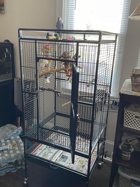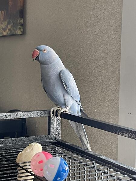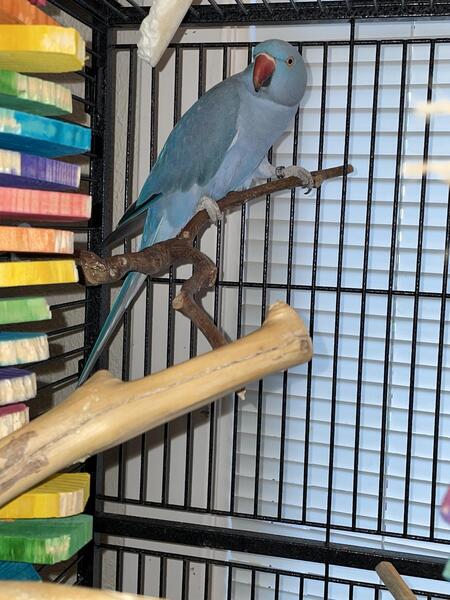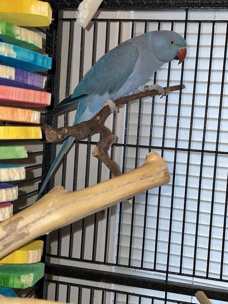 message bots18 about this ad Blue female Indian Ringneck. Not hand tamed but can be trained. She does step up on a stick when asked. She is also starting to step up on arms. Does come with cage. |