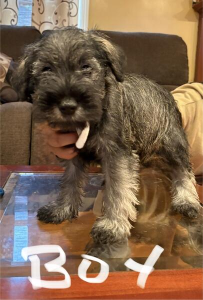 message amanda1286 about this ad 3 male 1 female born April 2025 . Tails docked dewclaws removed . AKC registered Mom and Dad on site. Vet checked up to date on shots and deworming. Crate trained. Youngstown Ohio Fields Family Schnauzers 234-228-3417 . Price reduced 9/2/2025 |