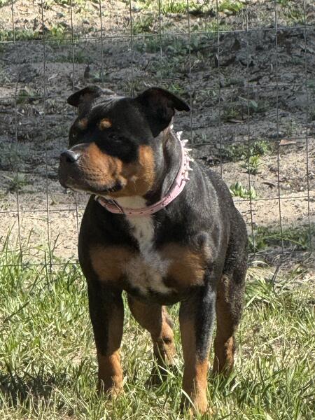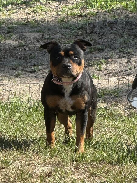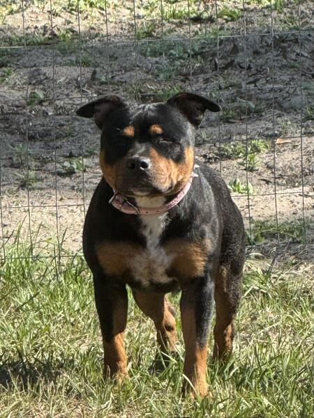 She just turned a year old. Shes petite for a staffy. Full of energy, athletic, enjoys walks.