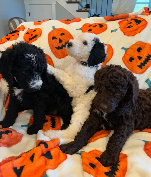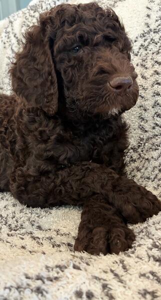 message monhollendoodles about this ad Born August 28,2025,to father f1b Irish cream golden doodle,mother is a chocolate standard poodle,Dew claws removed,wormed and first shots given,ready for new home,will be standard to large in size,very well socialized and potty training started,has never been in on the ground. |