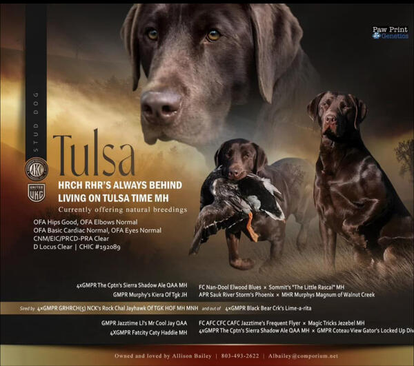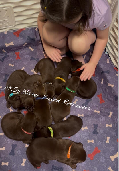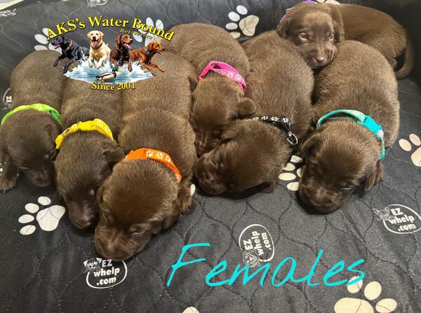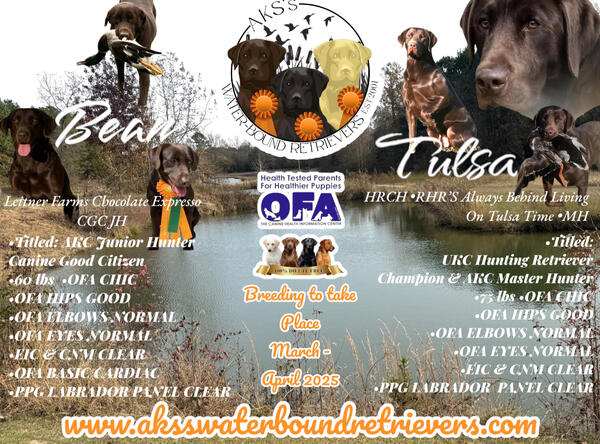 message akslabs about this ad ONE FEMALE AVAILABLE! Ready 8-9-25! Vet checked! Newport, NC 28570 All Dark Chocolates born 6-18-25 RTG: August 8th & 9th 2025 Contact me or see website for current availability! Videos/Pictures/details on our Five Star/Recommended Facebook page: AKS's Water Bound Retrievers WEBSITE> Upcoming breedings/litters #2 listed: AKSs Water Bound Retrievers Currently 2 FEMALES AVAILABLE ITS UNKNOWN WHAT 2 FEMALES ARE AVAILABLE UNTIL PICKUP WEEKEND AS ALL PUPS LEAVE IN THE ORDER HOLDING FEES WERE RECEIVED, SEE WEBSITE FOR DETAILS! Both Bean & Tulsa are TITLED,OFA CHIC & Dilute CLEAR! Dam: Bean CGC JH Sire: HRCH Tulsa MH |