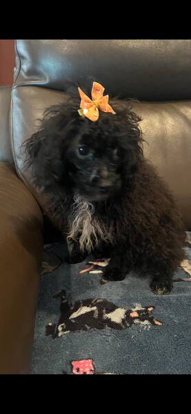 message lynbrook2000 about this ad Female, AKC Poodle pup. Small Frame, black coat with white trim. Current on health records and microchipped. She is very small framed and light weight. |