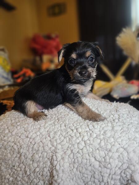 message taieshaa413 about this ad These adorable Chorkies are eating solid foods now and are being wee wee pad trained. They were born 2-25-25. Two brown ones are males and the black one is a female. |