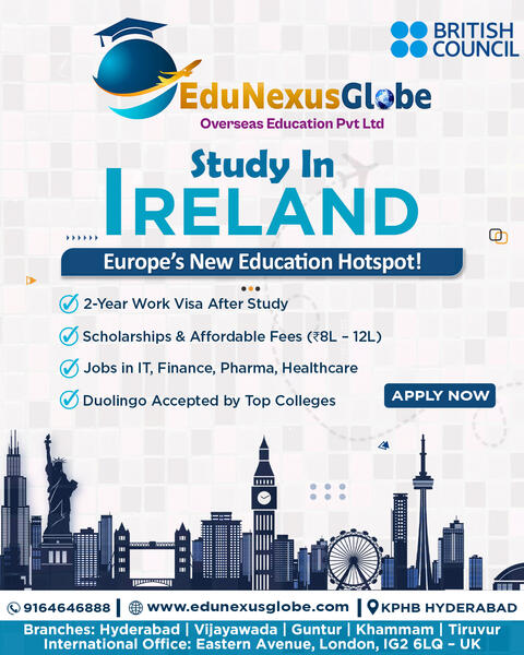 message edunexusglobe about this ad Why Choose Ireland for Your Higher Education? Ireland has quickly emerged as one of Europes most attractive destinations for international students. Known for its world-class universities, globally recognized degrees, and career-driven courses, Ireland offers a perfect blend of quality education, cultural richness, and excellent career prospects. For Indian students looking for a balance of affordability and opportunity, Ireland stands out as a smart choice. Key Benefits of Studying in Ireland 2-Year Post-Study Work Visa International students in Ireland are eligible for a 2-year stay-back option after completing their studies, giving them the opportunity to gain valuable global work experience. Affordable Tuition & Scholarships Tuition fees in Ireland are comparatively lower than in many other European countries, ranging between 812 lakhs per year. Along with this, several Irish universities and government programs offer scholarships that significantly reduce the financial burden on students. Thriving Job Market in Multiple Sectors Ireland is home to major global companies in IT, Finance, Pharma, and Healthcare. Students not only gain exposure to high-quality academics but also enjoy excellent employment opportunities post-study in some of the worlds leading industries. English-Speaking Environment As an English-speaking country, Ireland eliminates the language barrier, making it easier for international students to adapt, learn, and communicate effectively. Duolingo Accepted by Top Colleges Many leading Irish universities now accept Duolingo test scores, providing an easier and more flexible alternative for students who cannot take IELTS or TOEFL. Why Apply Through EduNexus Globe? At EduNexus Globe, we specialize in guiding students through every step of their study abroad journey. As a British Council Certified and ISO 9001:2015 Certified Overseas Education Consultancy, we provide complete assistance in: Choosing the right universities and courses in Ireland. Securing scholarships and financial planning guidance. Preparing proper documentation for visa applications. Offering end-to-end support from admission to accommodation. Our expert counseling ensures that your dream of studying abroad is fulfilled with complete clarity and confidence. Your Global Career Starts Here Ireland is more than just a study destinationits a gateway to global opportunities. With EduNexus Globe by your side, you can confidently take the next step toward an international career, backed by the strength of an Irish degree. Apply Now with EduNexus Globe and make Ireland your stepping stone to success! Location: Hyderabad, Telangana Phone: +91-9966111337 Website: httpwww.edunexusglobe.com Email: info@edunexusglobe.com forusa reviews forcanada reviews #ukstudyconsultancyinhyderabad message edunexusglobe about this ad |