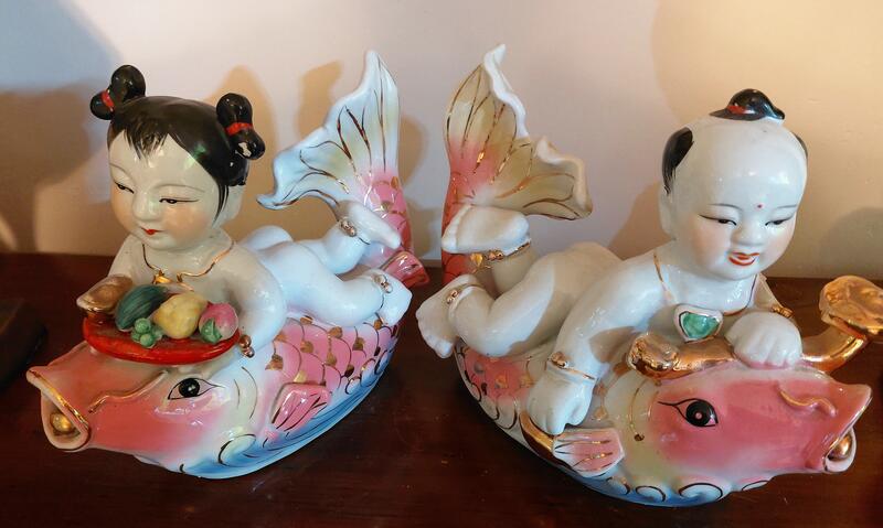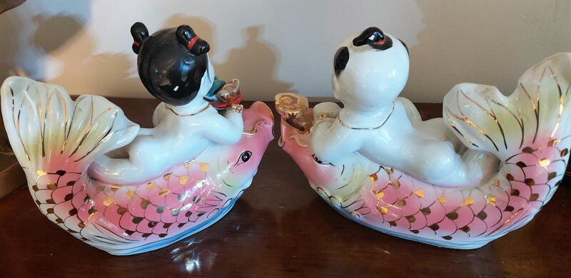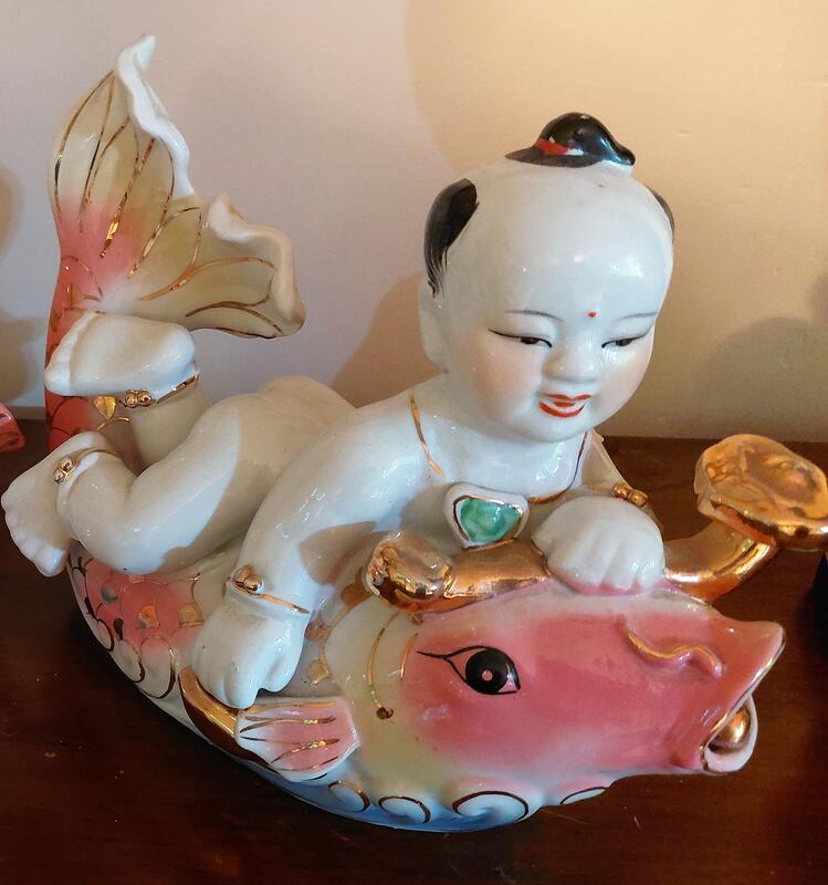 message pigglywiggly64 about this ad These striking pair of Chinese porcelain figurines featuring a baby boy & girl joyfully lying on top of a pink/gold koi fish, accented in vivid pink, gold, and blue. A powerful symbol of abundance and good fortune, its ideal for celebrating milestones or enhancing feng shui energy in any space. Wealth Luck Large. Excellent condition, very, very nice piece. Measures: 8"H x 10"W! Call or Text 786-589-9477 for more information! Este llamativo par de figuritas de porcelana china presenta a un nio y una nia acostados alegremente sobre un pez koi rosa/dorado, acentuado en rosa vivo, dorado y azul. Un poderoso smbolo de abundancia y buena fortuna, es ideal para celebrar logros o mejorar la energa del feng shui en cualquier espacio. Suerte y riqueza en gran tamao. Excelente estado, una pieza muy, muy bonita. Medidas: 20 cm de alto x 25 cm de ancho. |