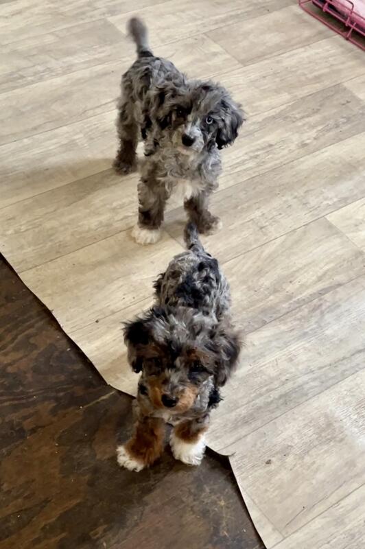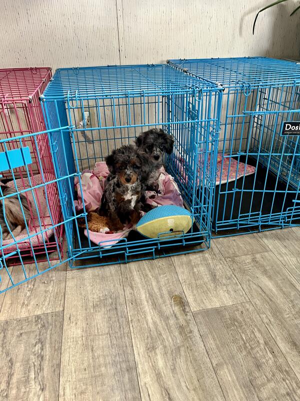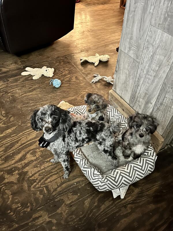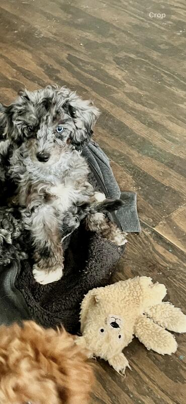 message aussiegirl about this ad Large toy/ small miniature poodle. He has really cool markings and blue eyes (1.5 His mom is far left in dog bed pic. Tiny. Well behaved. |