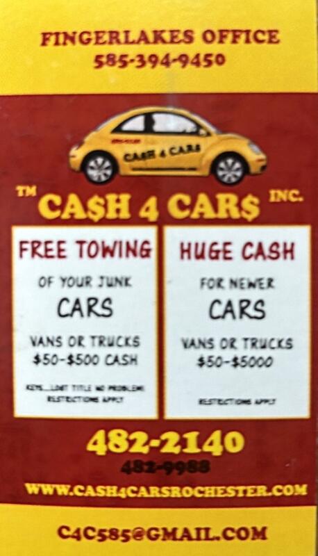 message cashforcarsrochester about this ad Do you have a car, van , truck or SUV that is damaged, not running or simply no longer wanted? Have you recently been in an accident that resulted with your car totaled or undrivable? Have insurance companies left you with limited or zero options? Cash for Cars Rochester is the quickest and easiest way in Upstate New York to turn your unwanted vehicle into cash right now! Weve been in business buying, towing away and recycling used cars, trucks, vans and SUVs for decades. No keys? No problem! We provide FREE TOWING for sold Junk cars, and pay HUGE CASH for Newer Cars! Vans/Trucks (Junk Cars) $50500 Cash (Restrictions apply) Vans/Trucks (Newer Vehicles) $505000 Cash (Restrictions apply) Contact us for a FREE QUOTE! |
