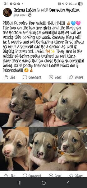 message selena970 about this ad Puppies ready to go their forever homes 6 weeks old. Has their first set of shots and almost 100% pad potty trained they have their days. Top two are girls and the bottom three are boys. $500 obo the other to are the mom and dad message me here or my number 9703716359 |