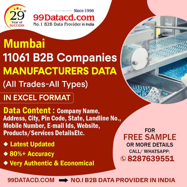 message dataprovider about this ad Are you seeking for list of manufacturing companies' data in Mumbai? Look no further! Visit 99Datacd a trusted database provider company based in Delhi. Buy 11061 Mumbai Manufacturers (All Trades) Data - In Excel Format. The list of manufacturing companies covers Multi National Companies, Co-Operates Companies, LTD/PVT LTD/LLP Companies, Micro, Small & Medium Business Houses, Many More data. Our verified data includes Company Name, Address, City, Pin Code, State, Landline No Mobile Number, E-mail Ids, Website, Products/Services Details. Our Data is Useful for Calling, Whatsapp Marketing, E-mailing, Bulk SMS, for Any Business / Industry / Trade For your Business Growth. Get a Flat 30% discount! Hurry! Grab this deal before its gone! For a free sample/ more details, call our experts Call/ Whatsapp: 8287639551 Email ID: sales@99datacd.com Address: 206, RG Trade Tower, Netaji Subhash Place, Delhi - 110034, India Website: message dataprovider about this ad |