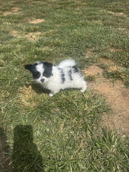 8 week old male pomapoo looking for loving home. Utd on shots and vet checked.