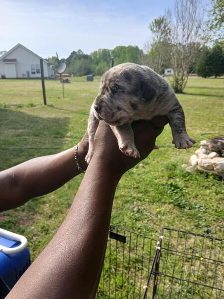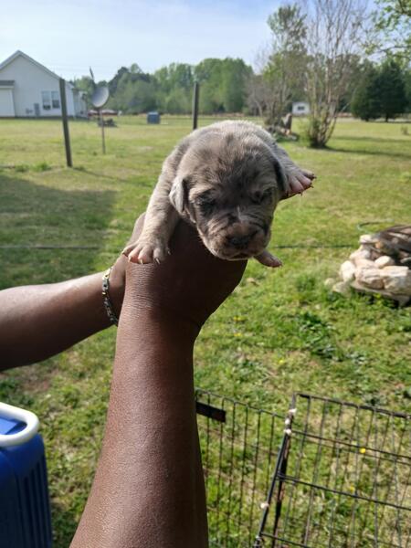 message mchlf8377 about this ad These pups are not the fat couch potato pets that cannot breathe or walk a block. These are athletic pups that will mature into protective loving dogs that will give their life to defend their people or property. Both parents love kids and accept strangers if the owner says it okay. The Father is a Cane Corso X Alapaha Bulldog mix. The mom is Presa Canario X Pitbull Terrier. Mom is 90 pounds, dad is 110. Again, these will not be the heavily built bulldog looking adults the look great but can not perform. These will be dogs that can excel at any sport use choose, from hog hunting to personal protection. Or the will be satisfied to be a loving companion thats biddable and eager to please. They should mature out to 80 to 120 pounds. This was a well thought out breeding that has been several years in the making. This is not our first litter, but the first litter offered to the public. Bullcity Bandogs. Litter of 8, but only 6 offered for sale. 3 males, 3 females. Pictures are parents at 7months old. The Sire pictured on the dogs house is now 110 pounds and still jumps on the 5 foot tall dog house the little effort. Very athletic dogs. message mchlf8377 about this ad |