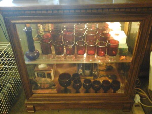 Lighted wooden cabinet with red ruby glass like new75.00 OBOtext only. 419-750-1046
