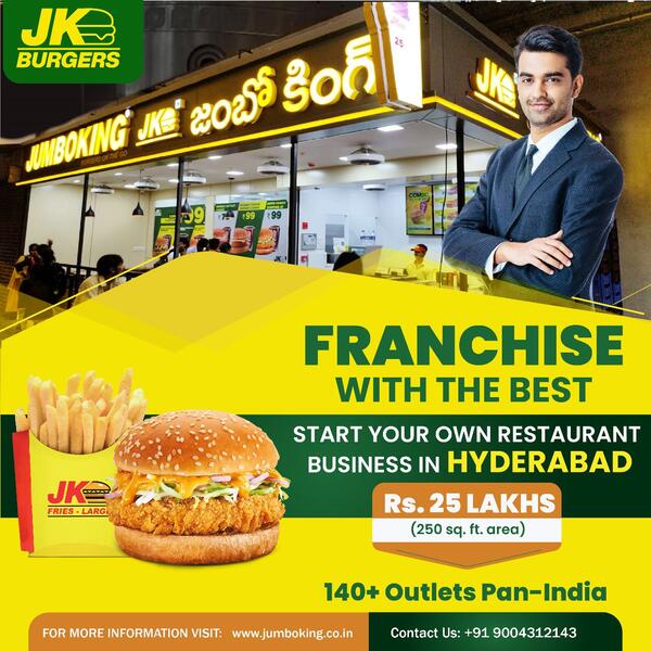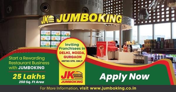 message jumbokingb about this ad Jumboking's franchise partners are guaranteed stability and profitability throughout the years by Jumboking's clearly defined franchise agreement. Jumboking specialises in selling fast-moving beverages and burgers, both of which are highly demanded by customers. Jumboking's inventive and tasty menu has helped it build a name in the fast food sector. Due to Jumboking's strong support and encouragement at every stage, franchisees can maintain consistency in quality and taste across all regions. Compared to its competitors, Jumboking is an easy investment because its franchise model costs just 25 lakhs for a 250 square foot carpet outlet. |