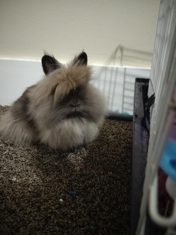 Long haired female rabbit with cage and everything to go with it.