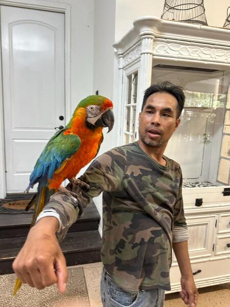 message bird about this ad Harlequin Macaw Beautiful Parrot Male Tame and Talking - Says "I love You" 3500 Call For Any Questions Seven 0 Four - Two 5 Four - 0 Nine 5 Seven |