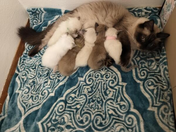 message ragdalore about this ad Born on October 14th 2023 This boy is a ham He just wouldnt stop making funny faces at me during pictures so we just rolled with it. The bloopers reel on this guy is hilarious and long He is the biggest in Rosies litter and this is the last litter out of Rosie and Texas Ranger. Mama had a very difficult time delivering these babies so she will not have kittens again and she will retire. These kittens will have medium long bunny soft and low maintenance coats. Our kittens are snuggled and played with often so they are ready for family life when they go home. I am a TICA registered breeder and all of our Ragdolls are registered. We genetically test all adults so its not possible for kittens to develop any genetic disorders and for further reassurance we also offer a genetic and health contract guarantee. Please dont buy from breeders that do not genetically test even if you dont get a kitten from us. Its absolutely crucial for a kittens long term health. Feel free to call, or text any time of day for a faster response time. 712-240-6565 You can also visit our website httpswww.ragdalore.com/ Ask about retiring adults as well! message ragdalore about this ad |