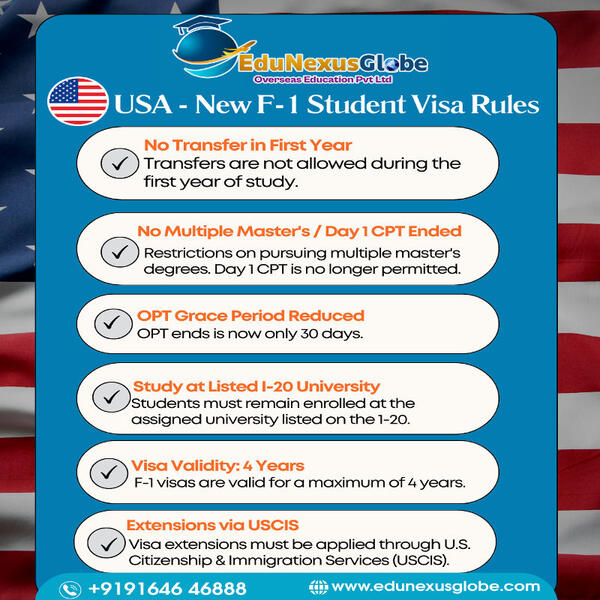 message edunexus111 about this ad The rules for studying in the USA have changed. No transfers in the first year, reduced OPT grace period, and an end to Day 1 CPT. Don't risk your visa status. Understand the new 4-year validity and extension process. Click for a clear breakdown from EduNexusGlobe. Location: Hyderabad, Telangana Email: info@edunexusglobe.com Website: httpwww.edunexusglobe.com Phone: +91-9966111337 forusa reviews forcanada reviews #ukstudyconsultancyinhyderabad |