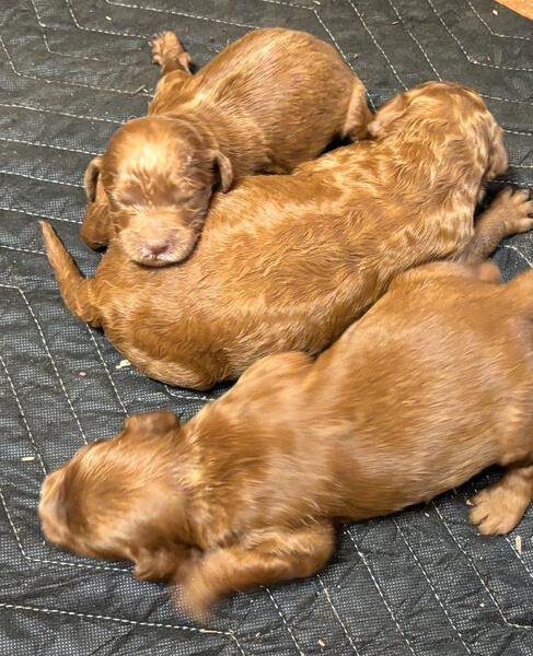 message j3priv about this ad F1B Red Standard Irishdoodles. Will be ready 12/10 but will hold until Christmas Eve if you desire. Will be dewormed every 2 weeks, vet cleared, and given puppy shot before going home. Zebulon NC. |