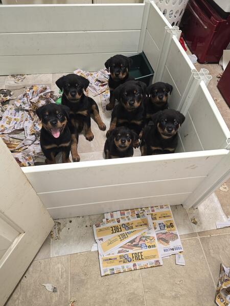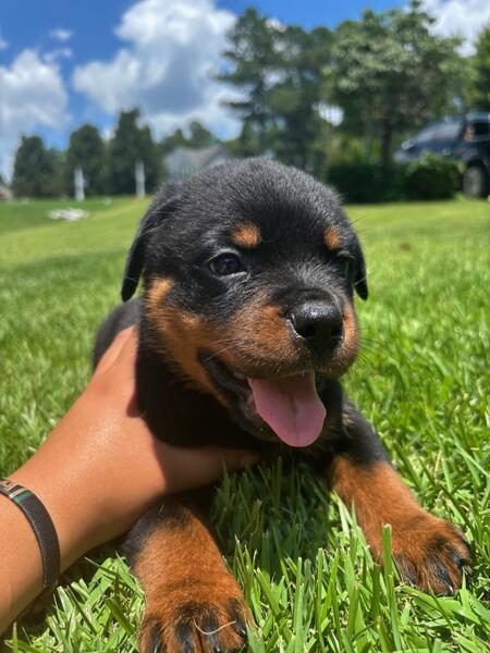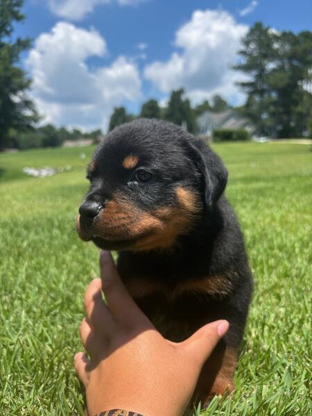message cblades about this ad Akc Rottweiller pups.German bloodlines parents on Premises Huge blocky heads.Pups are Dewormed with 1 series 5 way shots.Sire BLADES OTIS V DNA# 10076700 IDT2 SEIGER VP2 NIRK .Dam BLADES KALI v Konnenstolz DNA# V10076699 Call 925 628 2948 RDU area. call for shipping details fb C b Rottweilers " ' |