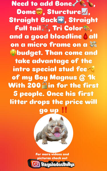 message regaladosbullyz about this ad Need to add Bone, Dome, Structure, straight Back, Straight full tail, Color and a good bloodline on a micro frame on a money budget? Than come and take advantage of me special intro stud fee on my boy Magnus @1K with 200 Lock in and get what you need, once his first litter drops his fee will go up. Check out his videos on my instagram @regaladosbullyz or come check him out in person am located in San Bernardino Ca. |