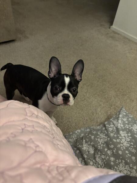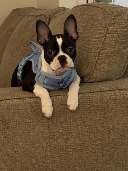 Male Boston pup born 5/24/25. Crate and pee pad trained. Up to date on shots. Comes with everything.