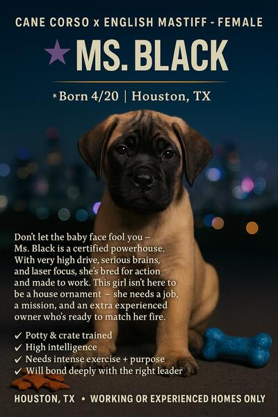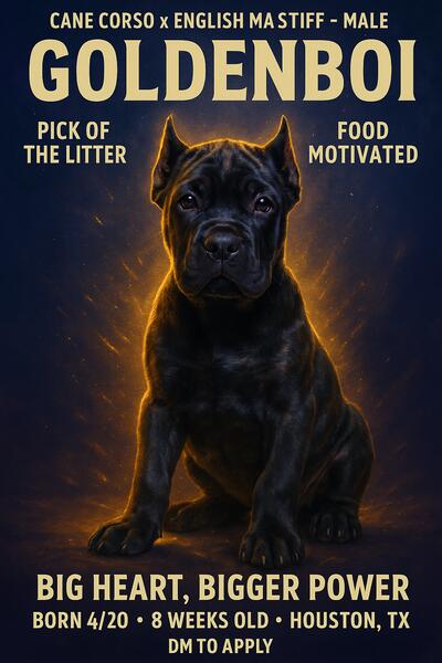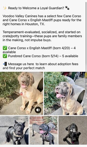 message vvcmastiffs about this ad FAQ Voodoo Valley Canines Q: What breeds are available? Cane Corso x English Mastiff (born 4/20) Purebred Cane Corso (born 5/14) Q: How old are they? 3 months and 2 months respectively. Q: Are they trained? Started on crate and potty training foundations. Socialized with people and other dogs. Q: Where are you located? Houston, TX. Q: How much are they? We discuss adoption fees privately to ensure responsible placement. Message us or text 832-817-4588. Q: Can I visit them? Yes! Well schedule a meet to make sure its the right match. We believe in lifelong placementsnot impulse buys. |