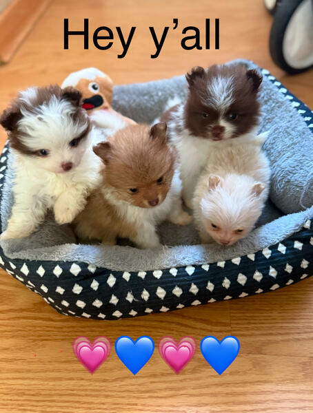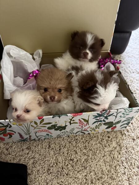 message pattyj69 about this ad Pomeranians pure bread 4 Puppies Total Born 7/2/2025 Male Parti chocolate whit markings (Available) Male Chocosable w/ white markings (Available) Female Parti chocolate (SOLD Female Cream with white markings (SOLD) Parents On Site Black/ White Parti ( Father) Chocolate/ white markings (Mother) Vet Checked with first shots/dewormed Ready for pick up or can Meet. Taking deposit to hold your new baby! Thank you for looking Text: Seven three 4. 7.5.5. Nine six four seven |