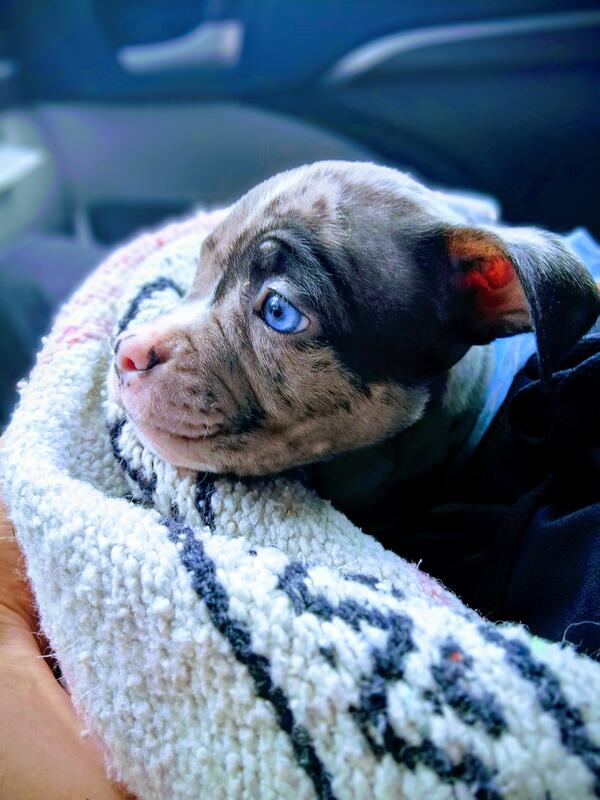 Female merle pocket bully she has two different colored eyes. Abkc registered with very sweet personality