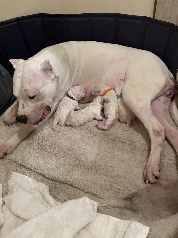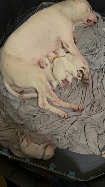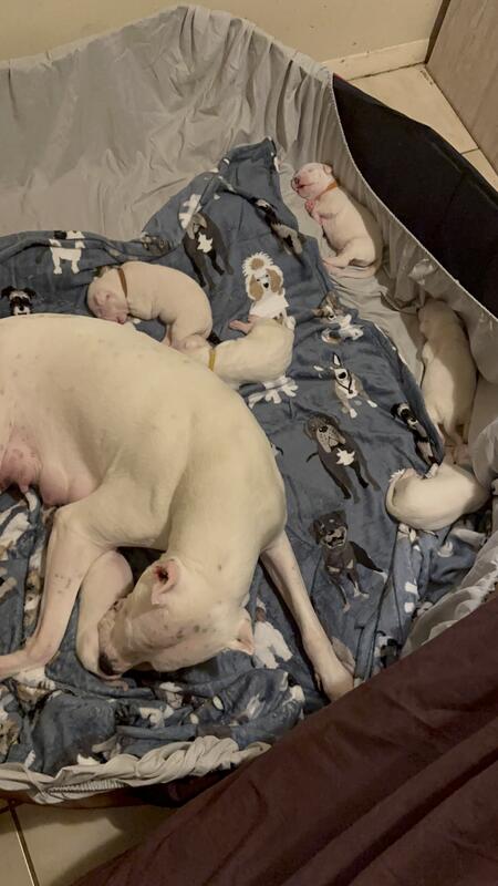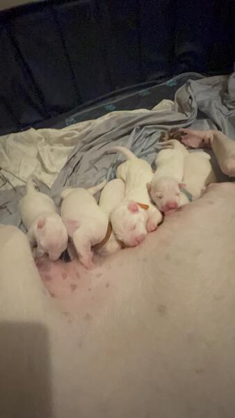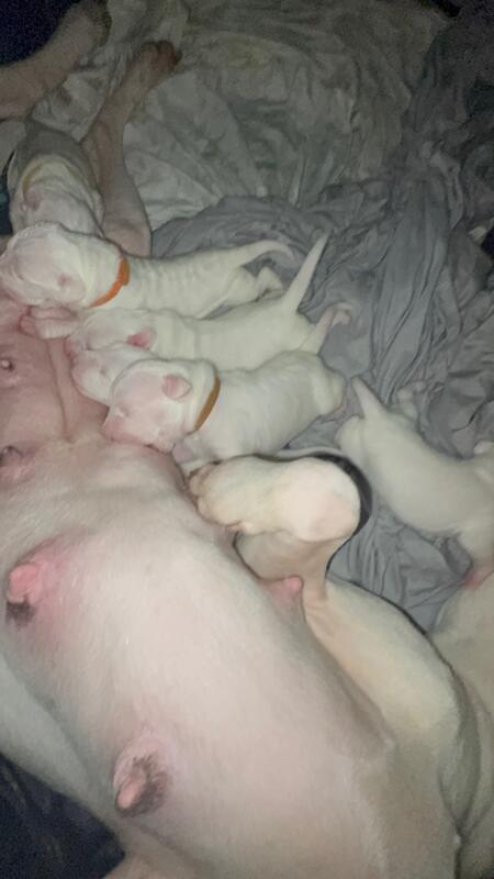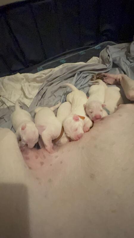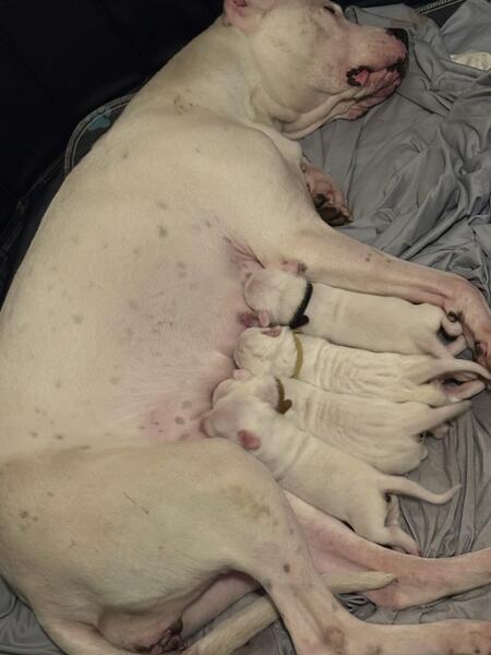 6 dogo argentino pups for sale. 4 males 2 females. Vaccinated and ready for a home on 10/28/2025 born August 29 2025