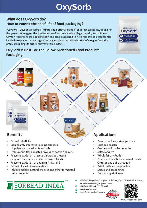 message tamana about this ad "Sorbead India is the global manufacturer of Oxygen Absorbers that offers the perfect solution to all packaging issues against the growth of oxygen, moisture, the proliferation of bacteria and spoilage, mold, and mildew.Oxygen absorbers are added to any enclosed packaging to remove or decrease oxygen levels in the package. Our oxygen absorber absorbs 98% of oxygen from the product keeping its entire nutrition value safe.Our food-grade oxygen absorber can be used in vacuum-sealed packaging as well as in manual sealed packaging. During the flexible or vacuum packaging process, packets or containers are perfect mouth-feel and closed adequately to have an oxygen-free environment from the package. For More Information, Please Contact or Visit - +91 9879203377 | " |