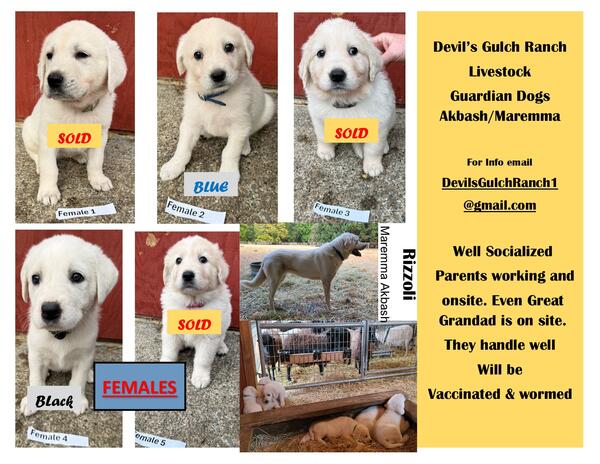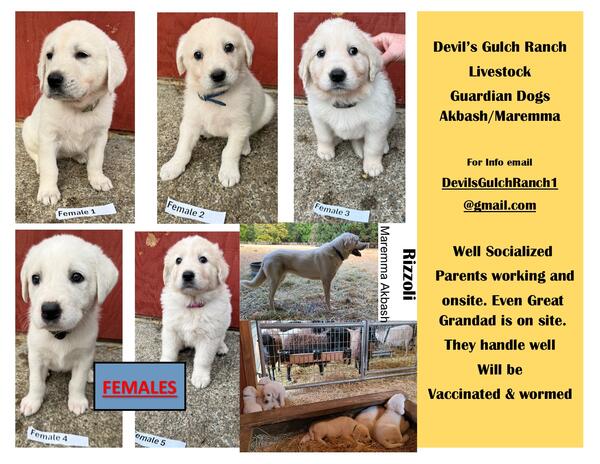 message devilsgulchranch about this ad Born 9/14/2025, on a sheep ranch to working parents. These Akbash/Maremma will be wormed, vaccinated, microchipped, socialized and live with livestock. $500 deposit requested. These pups are from the Devil's Gulch Ranch line and Patteran Akbash. Both well respected breeders with generations of working animals. Please email DevilsGulchRanch1@gmail.com |