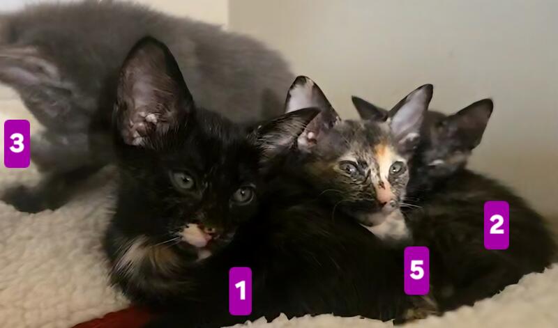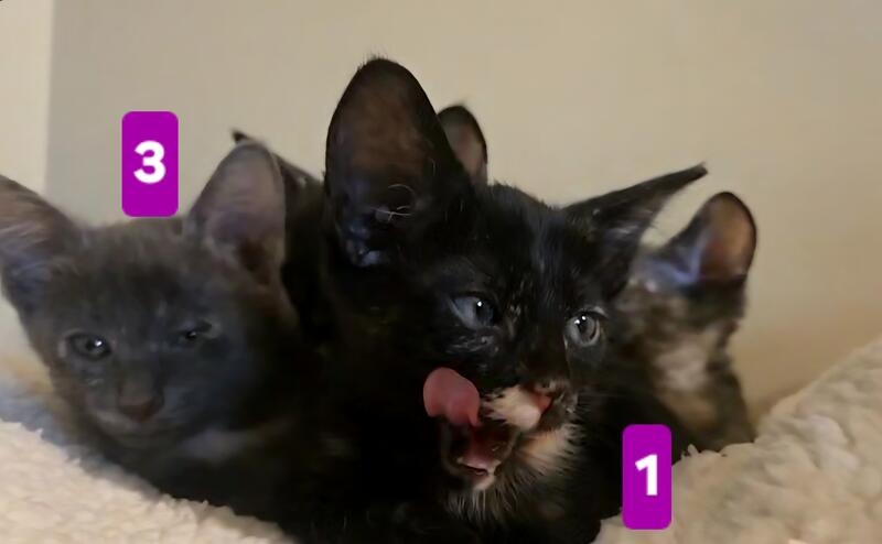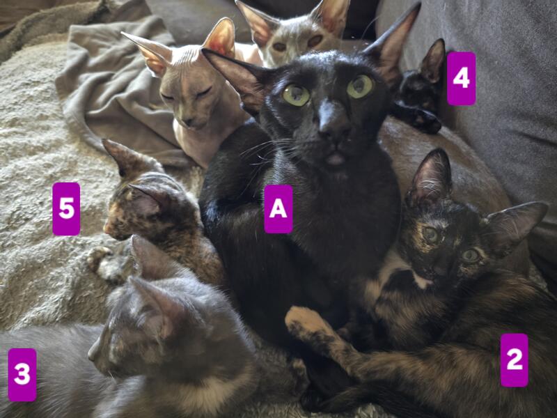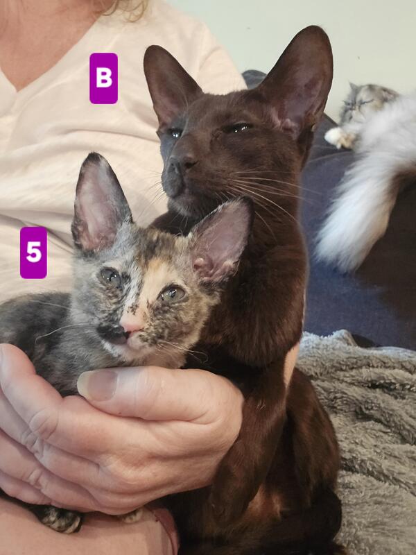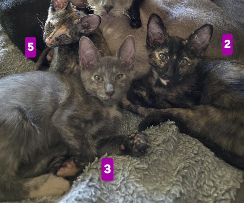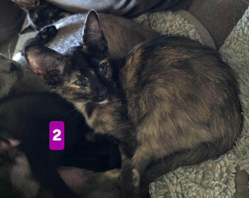 message magicpaws about this ad These gorgeous babies definitely take after their Peterbald mom! Pointy faces, larger ears, sleek bodies but more than that, they have Peterbald personality! Like other full-coated Peterbalds, you'll have an easy to manage coat. (My bald Peterbalds need baths! The other coats are much easier to me, personally Enjoy the loving companionship of a Peterbald without the price of full-bred. Please apply after you have done your reading/research on the Peterbald breed, thank you - these kittens have been loved since before birth so great homes only need apply Four torties are all females, of course. One solid black male available! 1) Dot. She has a gorgeous white/beige "beauty mark" on her chin like a glamour star. Her tummy, which you will see often for belly rubs, is gorgeous! Sleek coat. $450 2) Copper. The white rings around her eyes have given way to beige, giving her the best tortie look, like copper wiring throughout her silky coat! Absolute lap kittie! She loves tummy rubs and playing. $450 3) Misty. A gray and peach tortie that reminds one of a beachy sky. She has one of our favorite traits - a special cream colored "Magic Paw Full of love, full of tummy rubs, the quietest most gentle of the group from the very start. $450 4) Big Boy. SO SLEEK! Why is he so big Big body, big brain, big heart, and big personality! Glasslike coat, bold, and so loving! $450. Sold pending deposit. 5) Sweet Pea. MICRO kitty, flock coat, full Peterbald in every way. The only way to know she isn't would be a DNA test. She has the most full-body tortie coloring and a stripey face. $2200. Sold pending deposit. Also in photos, mother (A grandmother (B) grandfather (fully bald (C and dad, (D) medium hair Orange Tabby (his undecsended testicles fooled us, so the young gentleman, who is now ours also, helped create these beauties. His personality is incredibly loving, smart, and full lap-cat, so though not full-bred, you are getting wonderful kittens message magicpaws about this ad |