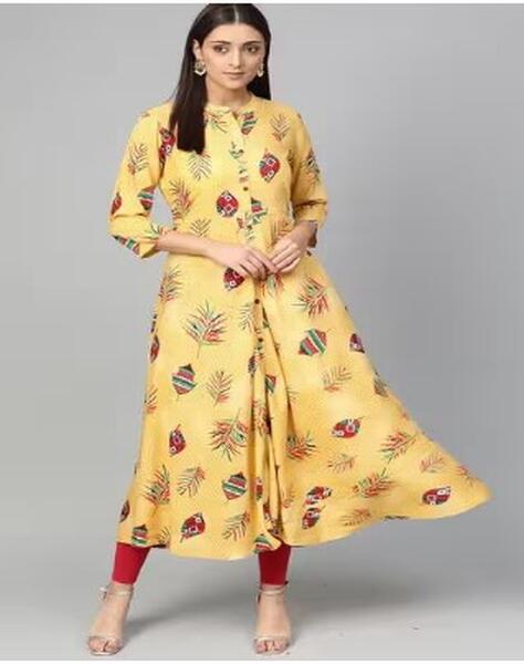 message rohinee about this ad Printed Flared Kurta Product Details Fabric Cotton Neckline Collar Length Ankle length Wash Care Machine wash cold Net Qty : 1 N Country Of Origin : India Commodity : Women's Kurtas & Kurtis Yellow and red colour combination kurta round shape kurta httpsajiio.in/o2G9elM |