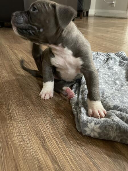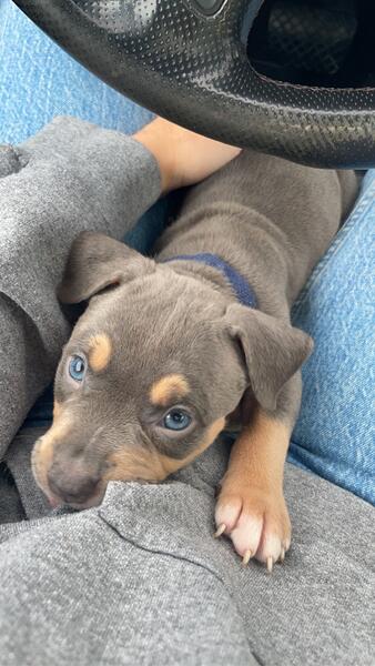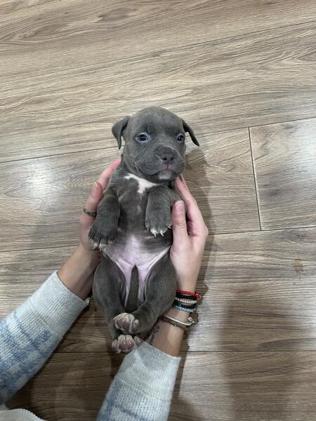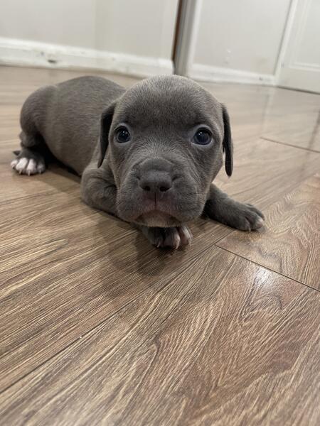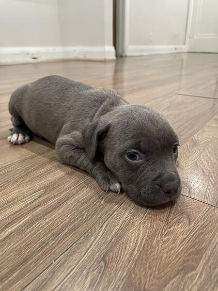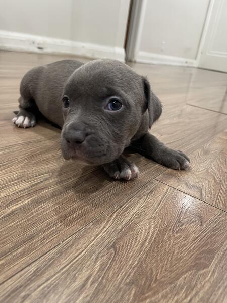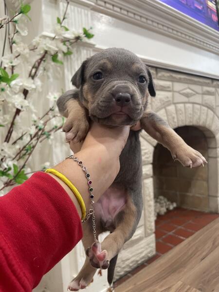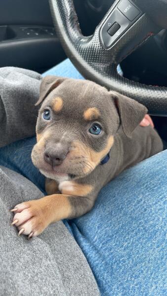 message xalexiou about this ad American bullys blue nose looking for their forever homes 7 weeks old , feel free to message with any inquiries and pricing. Only one male brown with blue eyes and one female grey with hazel eyes left. |