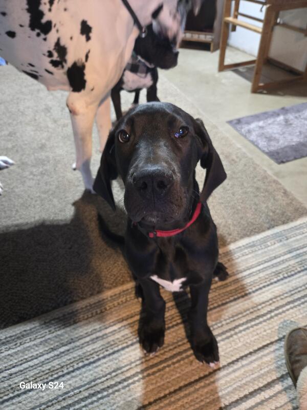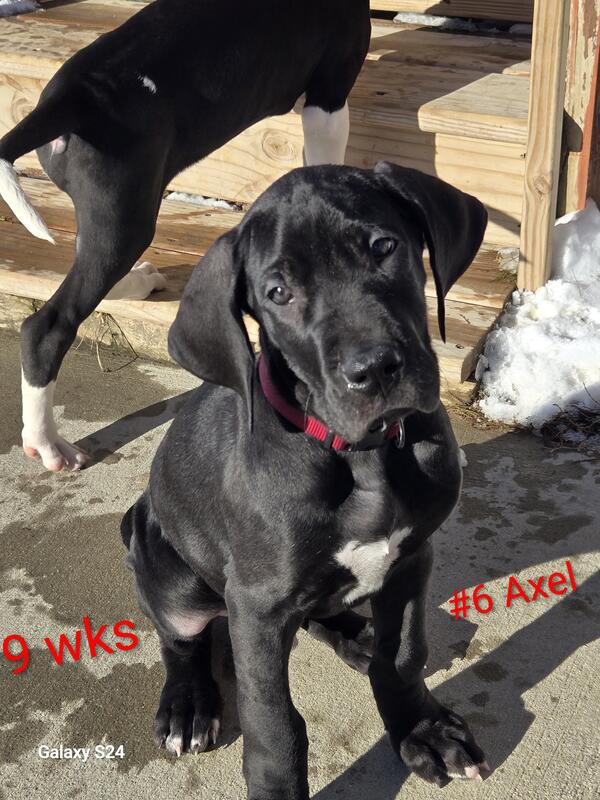 message hicksboxersdanes about this ad Born sept 29th 2025. Black to harlequin breeding. Litter of 12 with 4 still available. We have Axel a very sweet personality, very lovable, loves to be cuddled. He's doing great at basic training. Puppies are utd on shots and wormings. Pups come with akc registration & Full puppy package . Also a sample of food. If interested call or text 231-924-2983 for more info |