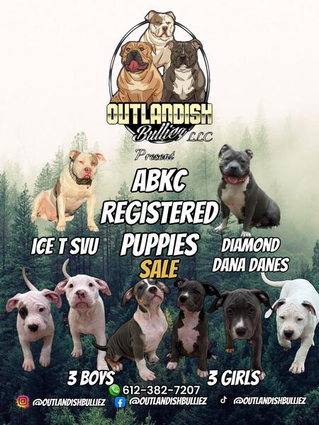 message outlandishbulliez about this ad ABKC registered American Bully puppies 3 available 1 boys 2 girls. Puppies are UTD on shot and deworming These puppies have championship bloodline line and and will definitely turn heads. If interested please call or text Brandon or Dana at 612-382-7207 or 651-313-1056 |