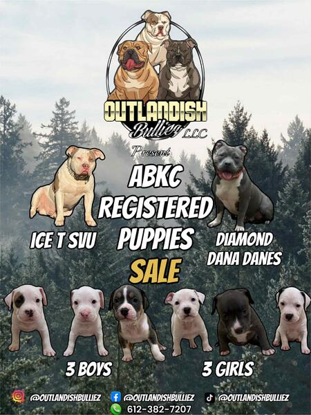 message dogsidodogsilove about this ad Hey all got sum XL bullys on hand they are four months old with all first year shots looking for forever homes three girls three boys left you see the asking price but willing to negotiate call me or my partner for more details serious buyers only please and will travel for delivery for a small fee lmk asap after this add hits they will sell fast 608-686-3116 or 612-382-7207 pics of mom and dad and there parents are also in gallery studding Is also possible |