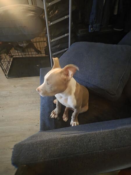 This handsome 8-week-old Pit Bull x Bully mix is ready for his forever home. Red nose & striking blue eyes super rare combo! Healthy, playful, and already alert Comes with his own cage save on supplies Perfect for a loving, responsible home This pup has a big personality and even bigger potential!