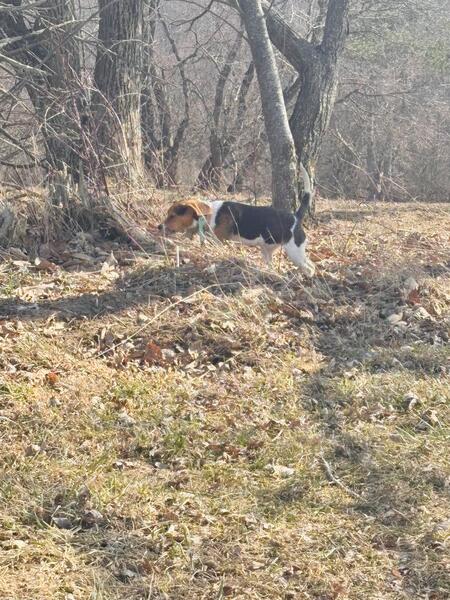 Needing to rehome a 1 year old female beagle. Not spayed, wants to hunt. Timid around larger breed dogs.