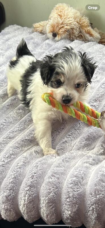 message furrybuttz about this ad This little guy is yorkie/poodle/Australian Shepherd all teacup and toys so will stay under ten pounds. He has one blue eye. He is a triple color. Playful, sweet, shots, wormed, Tail&dews done |